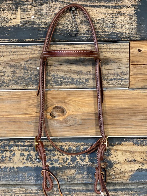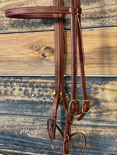 Double Buckle Browband. 5/8″ Doubled and stitched. Heavy Oil. Brass buckles. Horse Size.