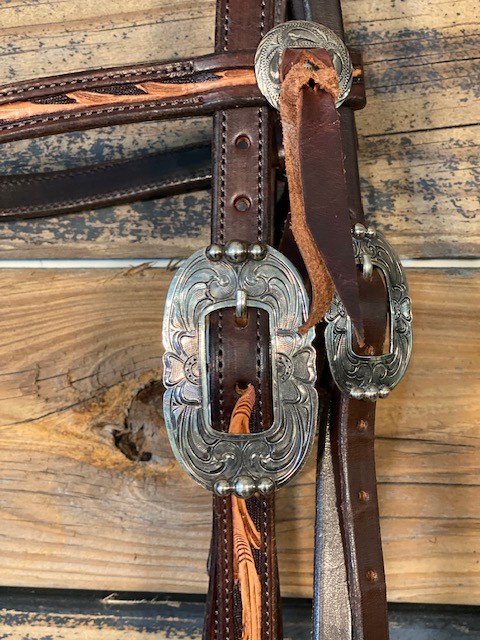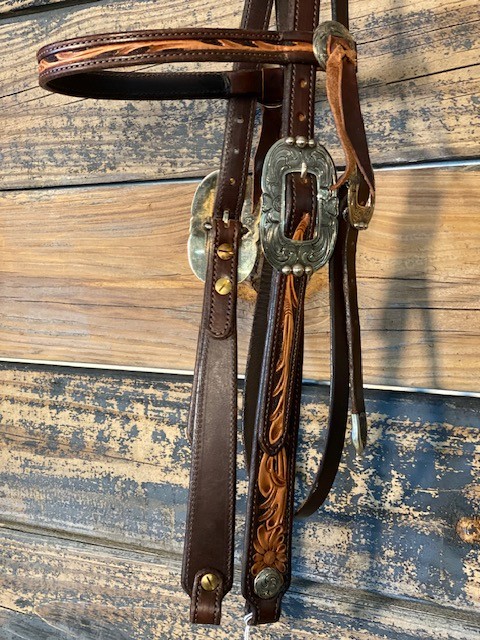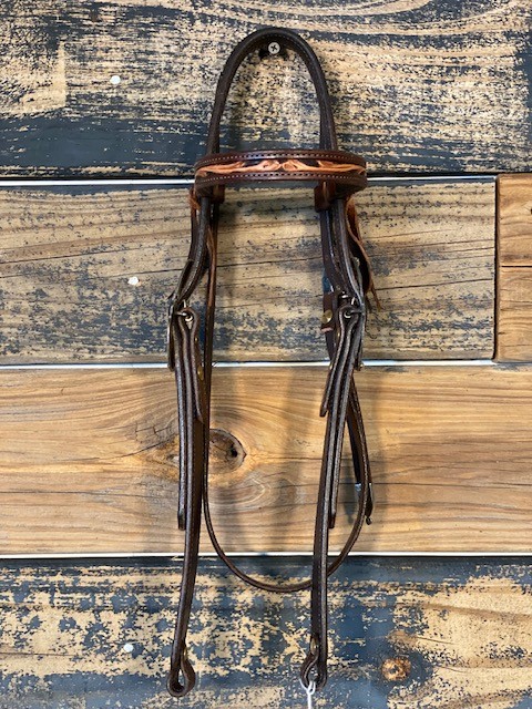 Two-toned floral tooled Browband Show Headstall. Made by Dylan Randall. Decatur, TX.