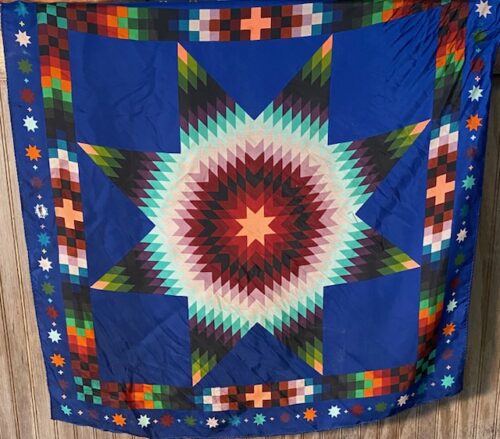 The Midnight Star Quilt comes in our Long-Tall size and is 100% Satin Silk. The third star quilt scarf that we have done, and this one makes a statement! A Beautiful bright blue with pops of bright orange, mint, brown, mauve, turquoise and greens. Looks great dressy or throw it on with a black t-shirt and jean jacket.