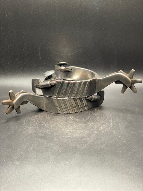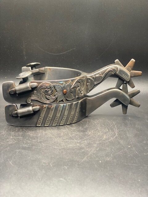 John Jennings Spurs. Double Mount. Handmade in Oklahoma. 1″ Band. 2″ Shank. 6 point rowel.