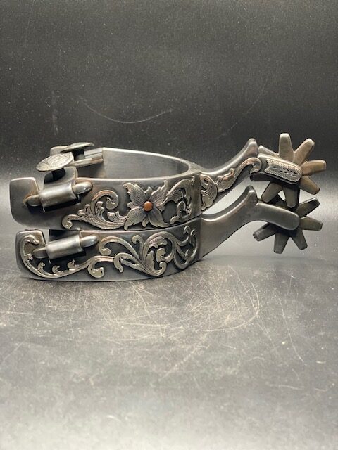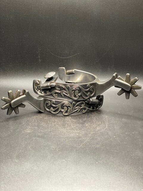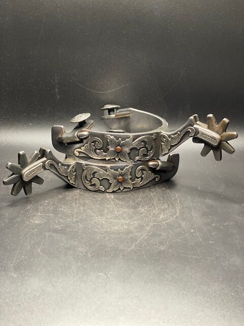 John Jennings Spurs. Double Mount. Handmade in Oklahoma. 1″ Band. 2″ Shank. 8 point rowel.