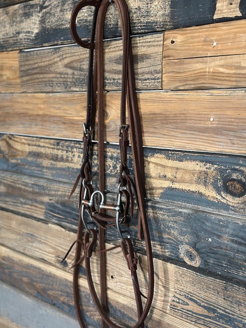 Kerry Kelley 50 20 Correction Bit with Dennis Moreland Doubled and Stitched Slide Ear Headstall and DM 5/8″ Heavy Single Ply Reins and Double Buckle Curb Strap
