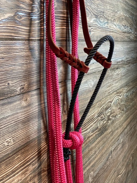 Loping Hackamore. Black Rope nose with leather hanger. Pink split reins. Made in Texas.