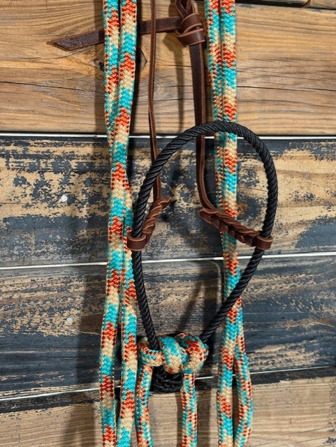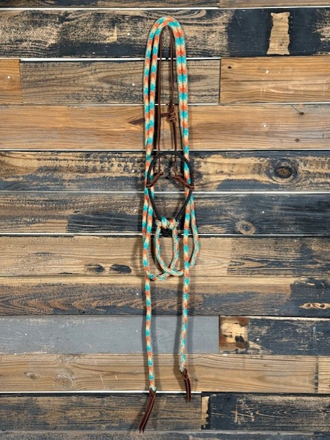 Loping Hackamore. Black Rope nose with leather hanger. Orange, Teal, and Tan split reins. Made in Texas.