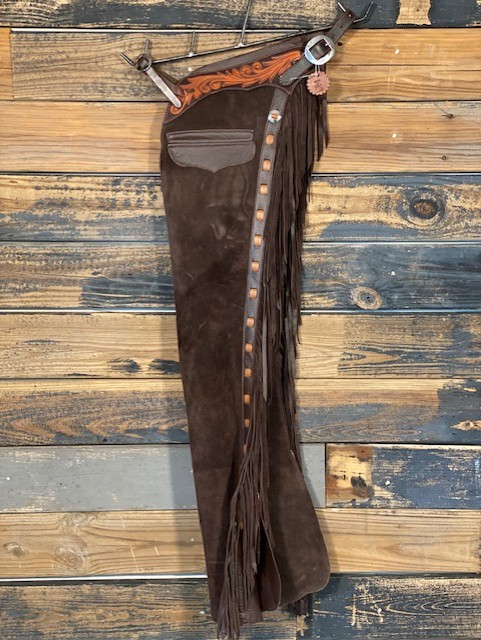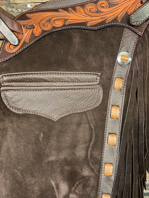 New Saddle House Shotgun Chaps. Size – Extra Small. Cafe Roughout. Pocket on the left.