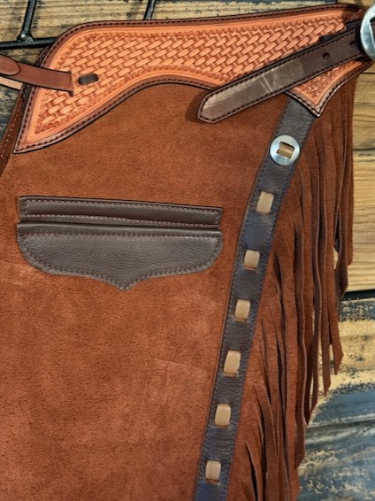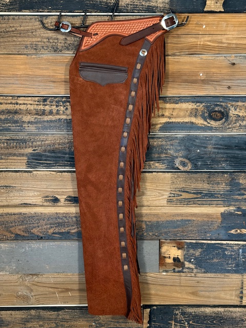 New Saddle House Shotgun Chaps. Size – Extra Small. Rust Roughout. Pocket on the left.