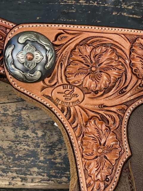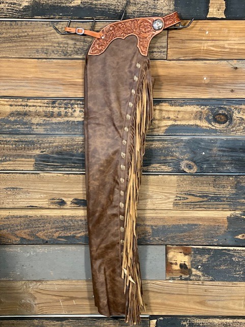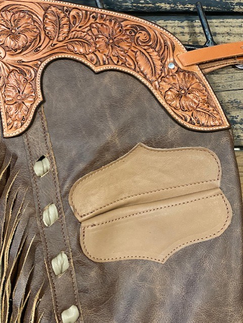 New Saddle House Shotgun Chaps by Bar Lyn Custom Leather. Size – Extra Small. Smooth Rum. Pocket on Right.