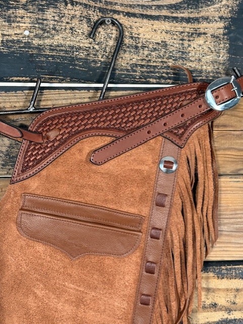 New Saddle House Shotgun Chaps. Size – Extra Small. Saddle Roughout. Pocket on the left.