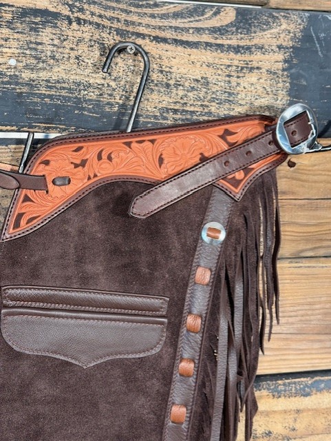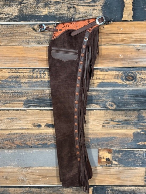 New Saddle House Shotgun Chaps. Size – Extra Small. Cafe Roughout. Pocket on the left.