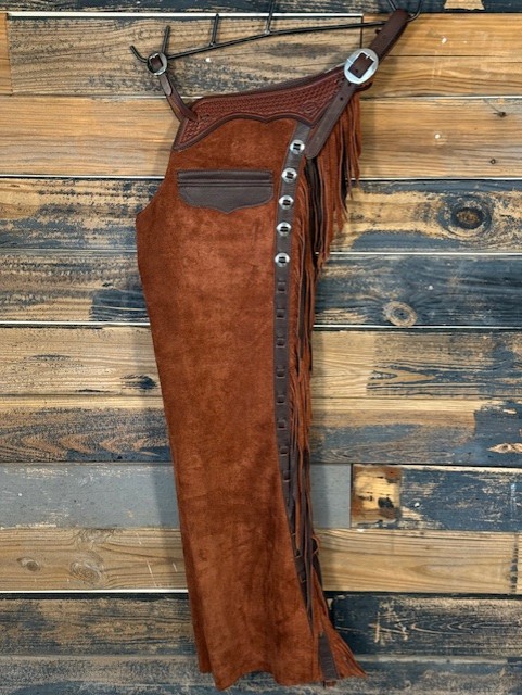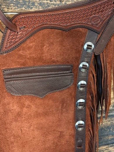 New Saddle House Shotgun Chaps. Size – Large. Rust Roughout. Pocket on left.