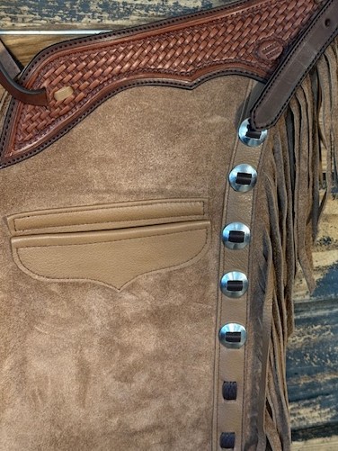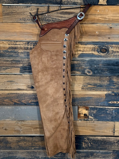New Saddle House Shotgun Chaps. Size – Large. Buckskin Roughout. Pocket on left.
