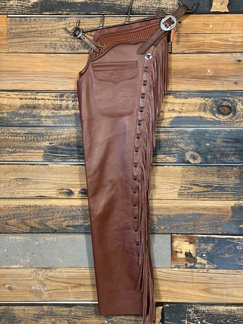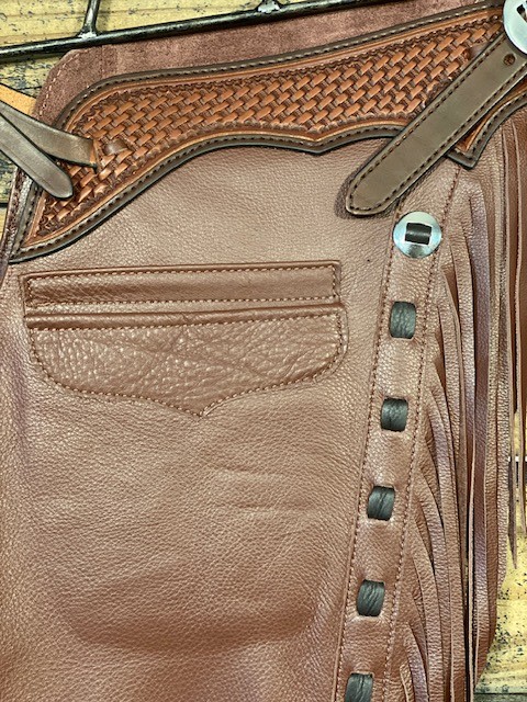 New Saddle House Shotgun Chaps. Size – Medium. Smooth Mahogany. Pocket on Left.