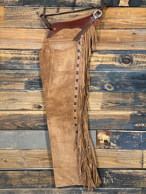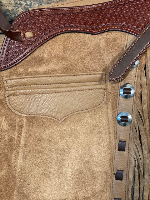 New Saddle House Shotgun Chaps. Size – Medium. Roughout Buckskin. Pocket on Left.