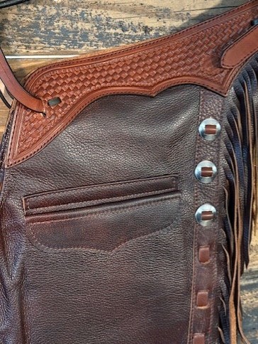 New Saddle House Shotgun Chaps. Size – Medium. Smooth Blackberry. Pocket on Left.