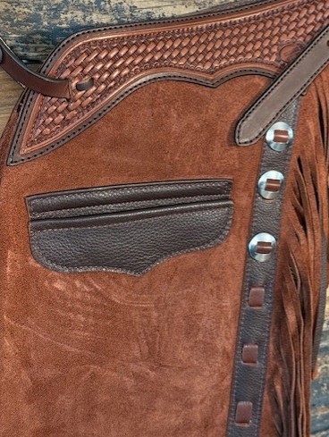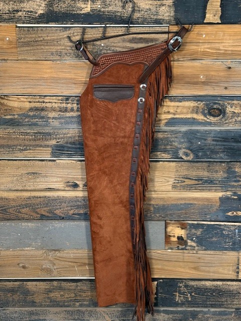 New Saddle House Shotgun Chaps. Size – Medium. Rust Roughout. Pocket on left.
