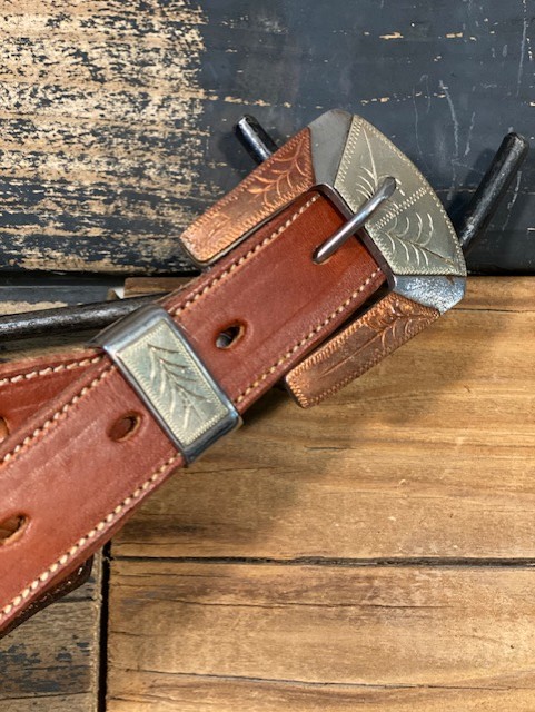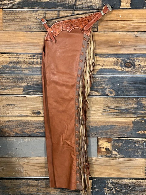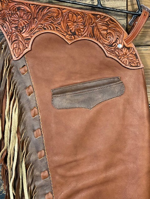 New Saddle House Shotgun Chaps by Bar Lyn Custom Leather. Size – Medium. Smooth Pecan with Double Fringe. Pocket on right.