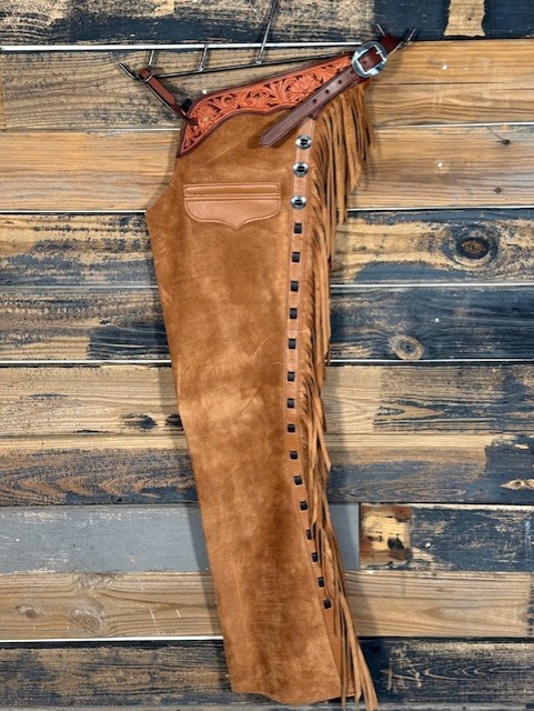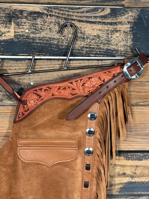 New Saddle House Shotgun Chaps. Size – Medium. Whiskey Roughout. Pocket on Left.