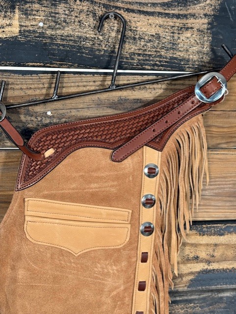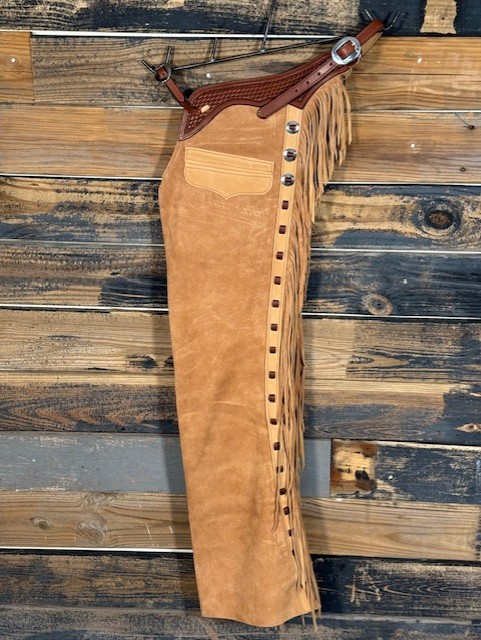 New Saddle House Shotgun Chaps. Size – Medium. Honey Roughout. Pocket on Left.