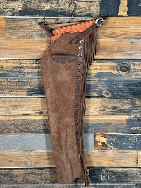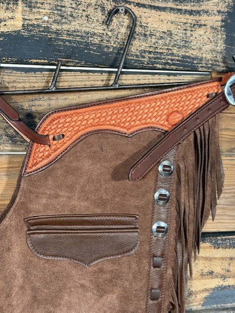 New Saddle House Shotgun Chaps. Size – Medium. Brown Roughout. Pocket on Left.