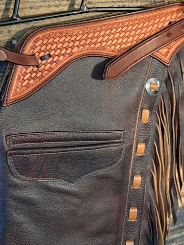 New Saddle House Shotgun Chaps. Size – Small. Smooth Blackberry. Pocket on Left.