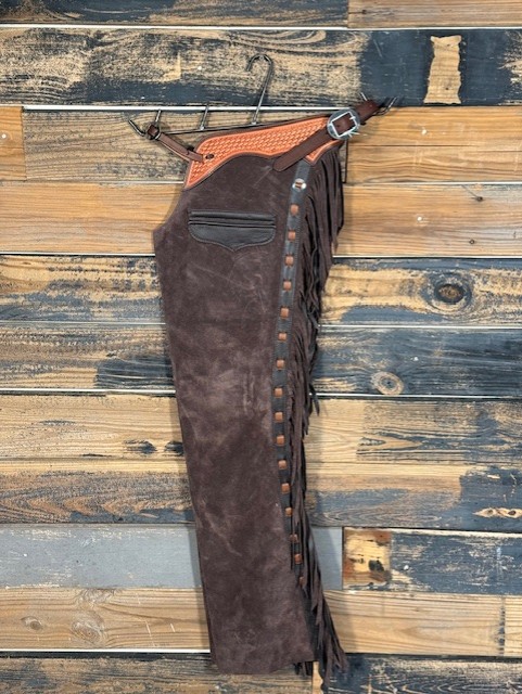 New Saddle House Shotgun Chaps. Size – Small. Cafe Roughout. Pocket on Left.