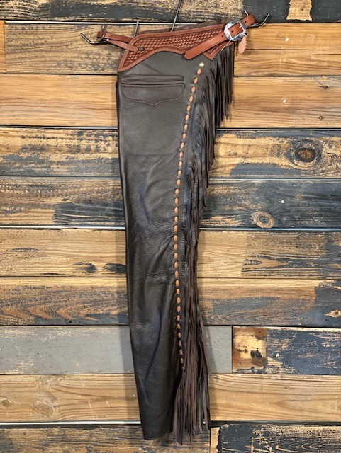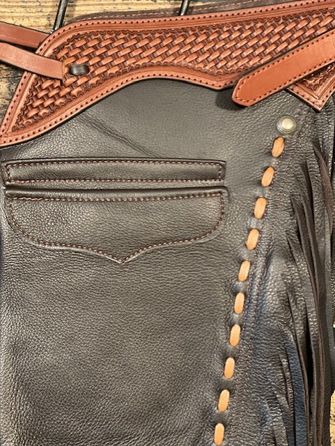 New Saddle House Show Chaps. Size – Extra Small. Smooth Dark Brown. Pocket on the left.