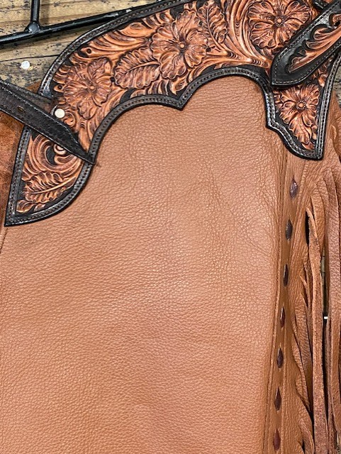 Lightly Used Saddle House Show Chaps by Bar Lyn Custom Leather. Size – Small. Smooth Light Brown. No Pocket.
